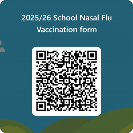 The school Nurses will be attending school on the 22.10.25 to administer the nasal flu spray. Please click on the link below or scan the QR code to complete a consent form for your child. Please complete the consent form whether you would like your child to receive the vaccine or decline the vaccine.
